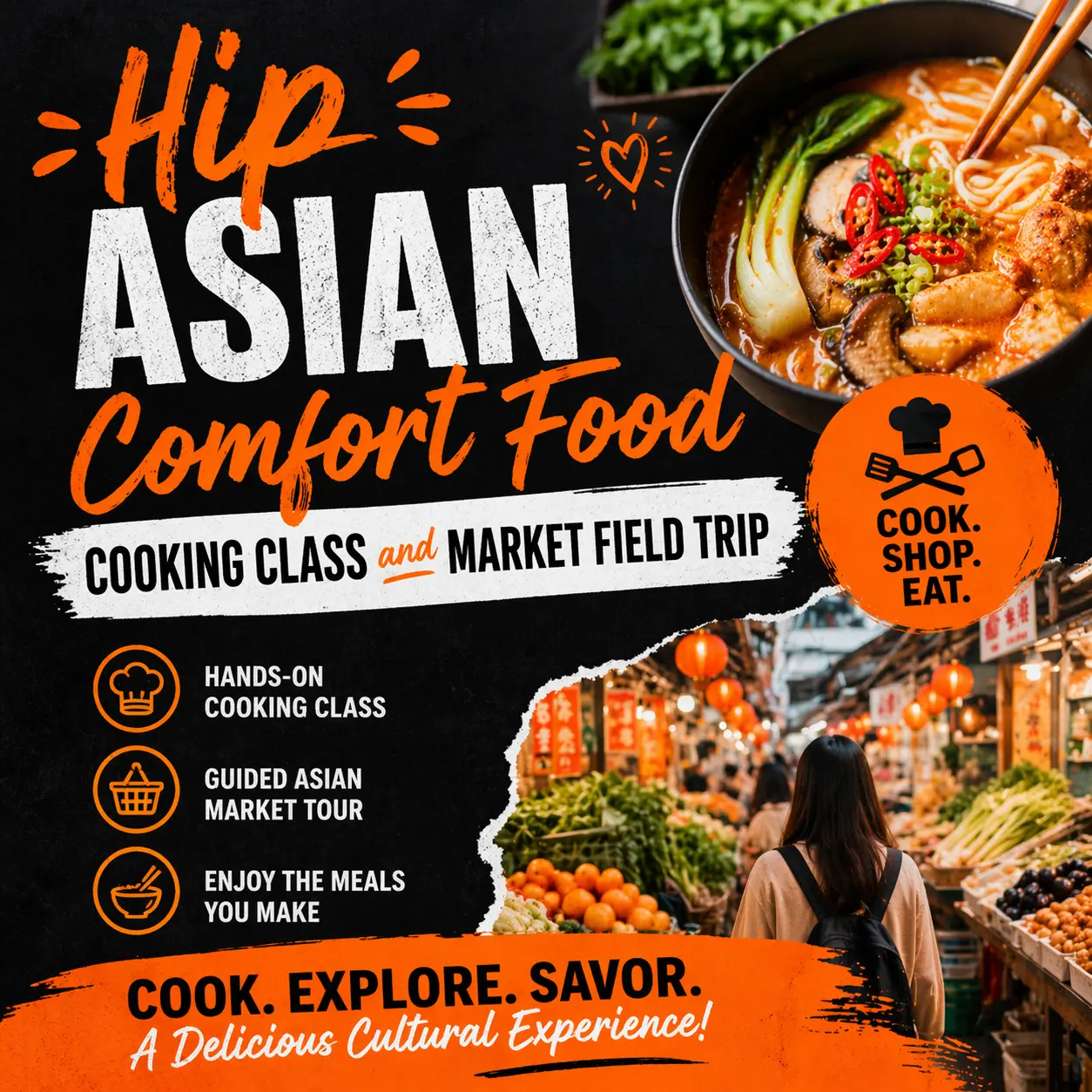 Ready to up your cooking game? Join us in person for a fun and hands-on adventure where we'll explore delicious HIP Asian comfort food recipes! First, we'll hit the market to pick fresh ingredients, then dive into cooking tasty dishes together from Chef Dennis Chan's Cookbook, Hip Asian Comfort Food. It's casual, interactive, and perfect for food lovers who want to learn some cool new recipes and skills. Don’t miss out on this tasty trip and tasty tips!